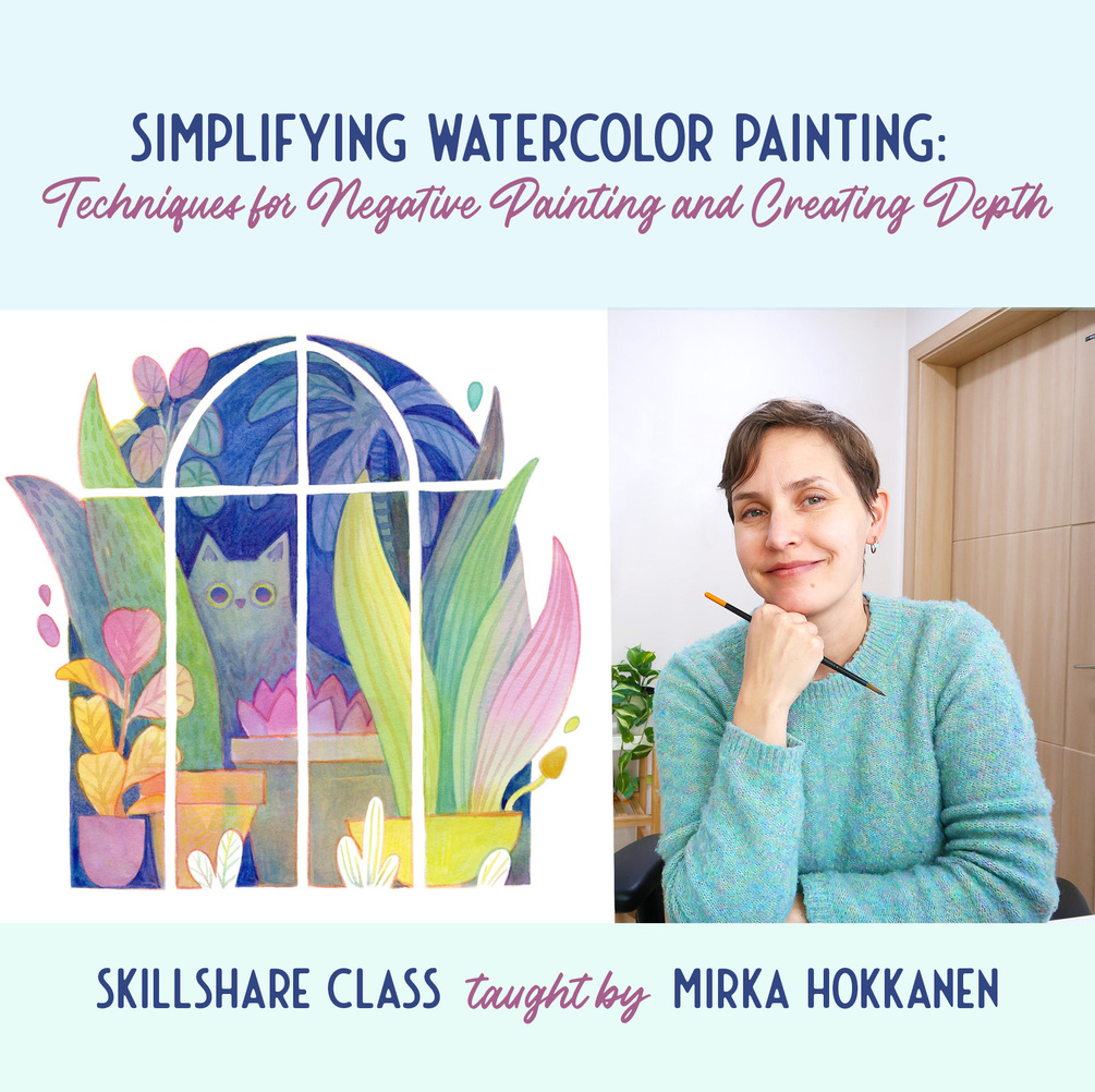 Join illustrator, author & educator, Mirka Hokkanen, as she teaches you how to explore watercolor behavior using the negative painting technique, and learn how to create a sense of depth in your paintings with three simple design principles. By the end of the class, you‘ll have a beautiful painting to keep or gift, and confidence in a new skill to add in your painting toolbox.